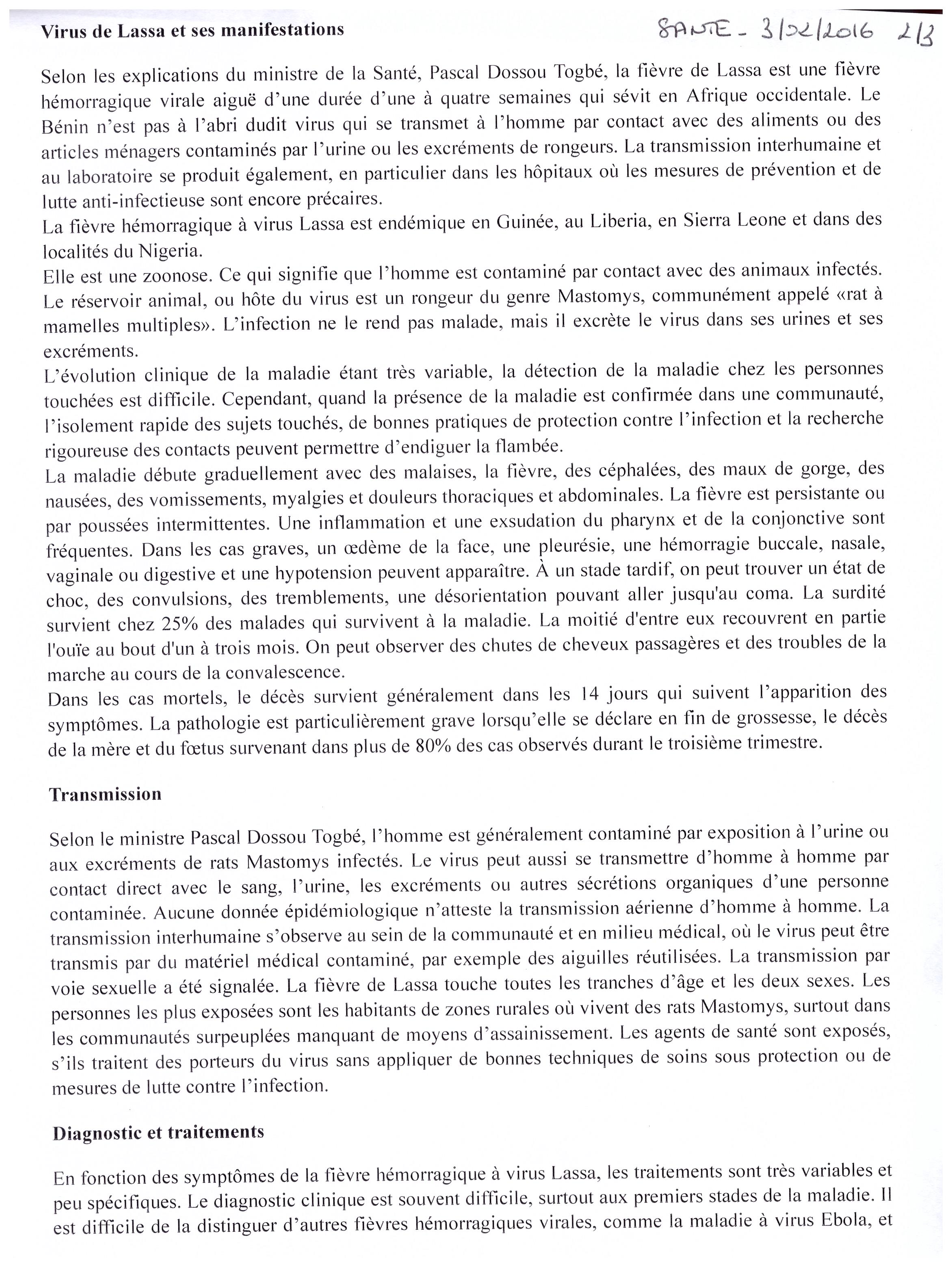 Petite revue de presse d’articles parus dans le journal Santé du Bénin, en janvier et février 2016